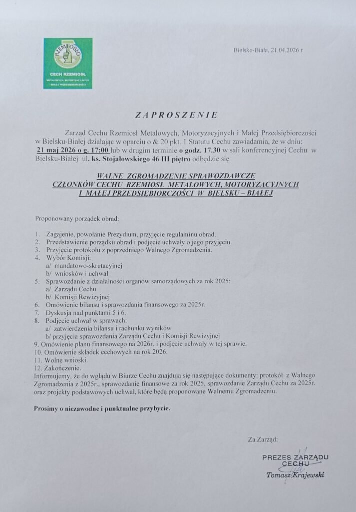 Zaproszenie na Walne Zgromadzenie dla wszystkich Członków naszego Cechu